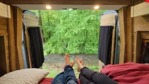 As I mentioned in May we rented a local van from someone who had converted his van with a unique build. He was local and we found him through “Outdoorsy”.  Before we committed, he allowed us to come and check out “Chaser” and taught us about its workings.  Chaser  didn’t have a shower and the fridge was small but we decided to make it work.  Being able to load our supplies directly from home was a plus from other rentals we had done.  Our overly ambitious goal was to visit some friends in North Carolina and make a loop back to eventually hook up with our daughter for one of her largest craft events of the year.