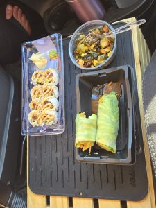 Since Thursday was a work day for us both and we wanted to continue our progress North, we found a rest stop where we parked and worked all day.  It gave us a chance to get our and stretch our legs every once in a while, as the day was quite mild. For dinner, we found a Mexican place with vegan cheese options, as well as gluten free on our path, San Marcos. When Steve saw they had ceviche he went for that.  It was very different, in a stack and very heavy on the avocado.  It was good, but I’m glad I decided on a veggie enchiladas instead.