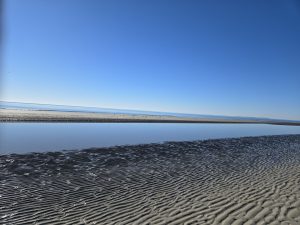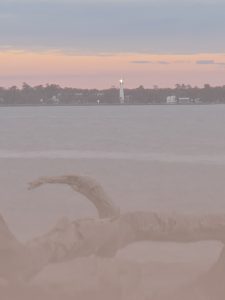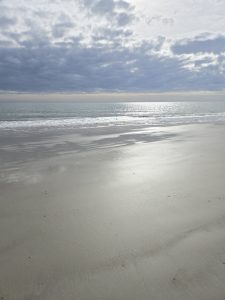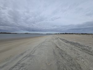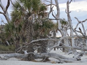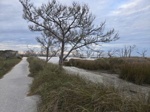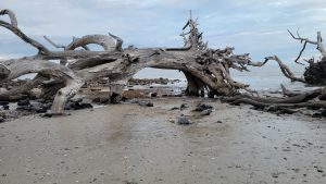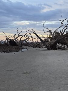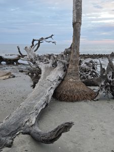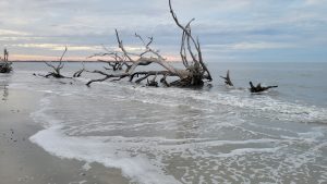 Saturday wound up being a very busy day.  Steve had an important meeting for work that had been added, so I was on my own again for the morning.  We drove to Tybee Island off of Savannah, so I could explore.  I got myself a breakfast sandwich at  The Surfing Goat, because how can you not go to a restaurant named “Surfing Goat”? The beach here too had wide hard packed sand and beautiful scenery.  The pictures below were mostly taken into the sun, so I wasn’t sure if I had captured the lovely colors of the sky until I got to look at them back in the van later.  As I rounded the curve on the peninsula, the scenery became more magnificent  and the area less crowded.  Loads of gorgeous shells were untouched in this isolated spot. The last few pictures were in a random yard on my walk back into town.