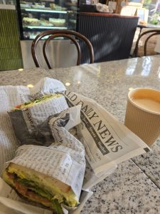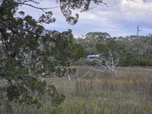 Before going to the new campground I had  first my daytime adventure.  Steve needed a place to work for the day, so we got up early and headed to Hilton Head Island.  We had time to order breakfast takeout from the Watusi Cafe which had a lot of very cool gluten and dairy free options.  We had looked at the parking lot across the street that was public parking for Coligny Beach and the sign said no RV parking.  Although we doubted that anyone would care in the off season, we were grateful when the helpful server at the cafe pointed out there was a smaller public parking lot just down the road.
